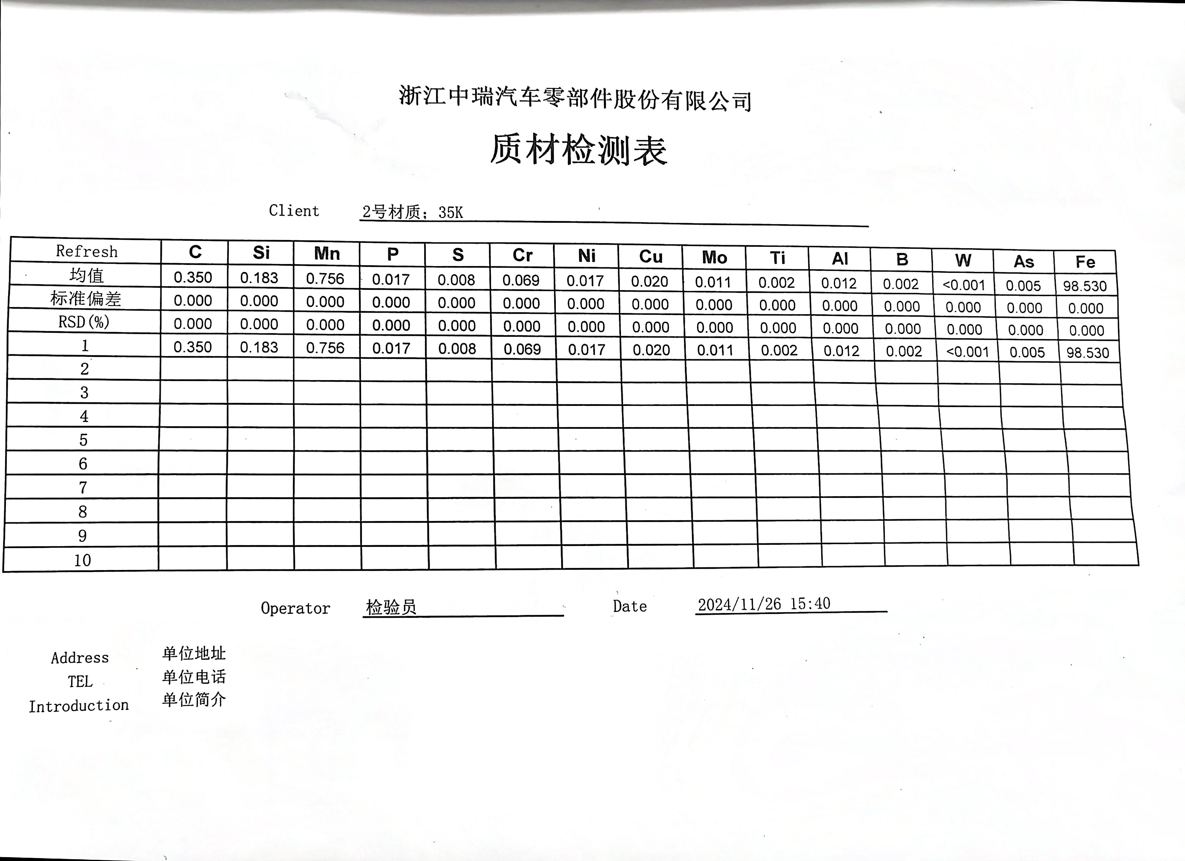 Untuk menunjukkan komitmen ini, kami melakukan yang ketat pengujian material Sebagai bagian mendasar dari kami Kontrol kualitas proses. Ambil, misalnya, proses verifikasi kami Bahan 35K , spesifikasi umum yang digunakan untuk banyak pengencang otomotif. Detail kami Laporan Pengujian Material memberikan snapshot yang jelas dari analisis presisi kami.